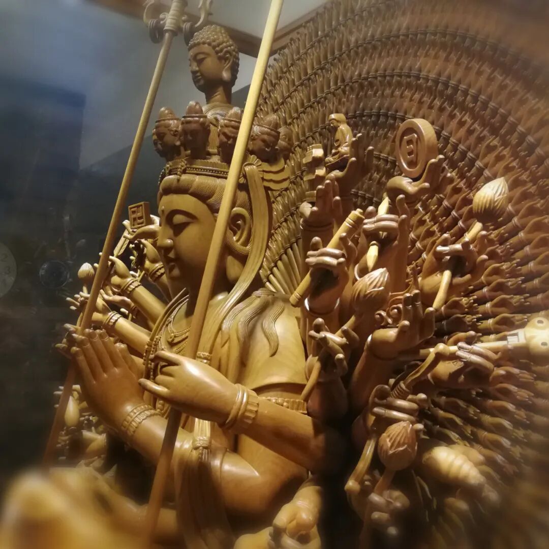 观世音菩萨,观自在菩萨,大家知道他是慈悲的象征,是智慧的象征。观世音菩萨,观自在菩萨,有大智慧,具大慈悲。他一个人的身体上能够示现千手千眼。具有一千只眼睛,就是大智慧的体现。有大智慧,就能照见五蕴皆空,照见万法皆空。能够把万法看得当体是空,就可以当下不被财、色、名、食、睡所迷惑,就能不被一切由物质现象和精神现象所产生的烦恼而动心。所以说,有智慧的人没有烦恼。观世音菩萨又有一千只手,这一千只手表示什么意义呢?表示大慈大悲。我们人类有种种苦难,人类的苦难体现为八万四千烦恼。众生有这么多的烦恼,所以大慈大悲的菩萨要示现一千只手来救苦救难,度一切苦厄。有一篇《观音回向文》作如是说:“过去正法明如来,现前观世音菩萨。”这位观世音菩萨,是过去已经成了佛的一位大觉者,为了度脱娑婆世界的苦难众生,所以示现为观世音菩萨。“于一身心,现千手眼。”在五蕴所组成的同一个生命形体上,示现一千只眼睛、一千只手。这千手千眼起什么作用呢?所谓“照见法界,护持众生”。一千只眼就是大智慧,照见法界的万事万物,照见法界众生的一切烦恼;一千只手就是大慈悲,以此护持、度脱我们这些苦难众生。观世音菩萨,大慈大悲,救苦救难,在人世间受到每一个人的尊重、称念、祈求。大家都知道观世音菩萨“有求必应,寻声救苦”。观世音菩萨与我们娑婆世界的众生特别有缘。因为菩萨具有宏大的愿力、甚深的智慧,对于每一个苦难的众生都能平等照见,平等护持。