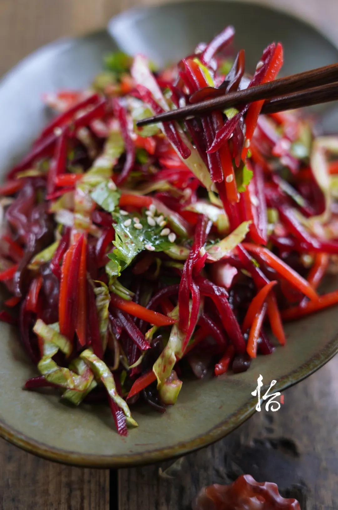 1、甜菜根、胡萝卜、木耳、球生菜、切丝,甜菜根汆烫1分钟(去除草酸)沥干备用,香菜切末。