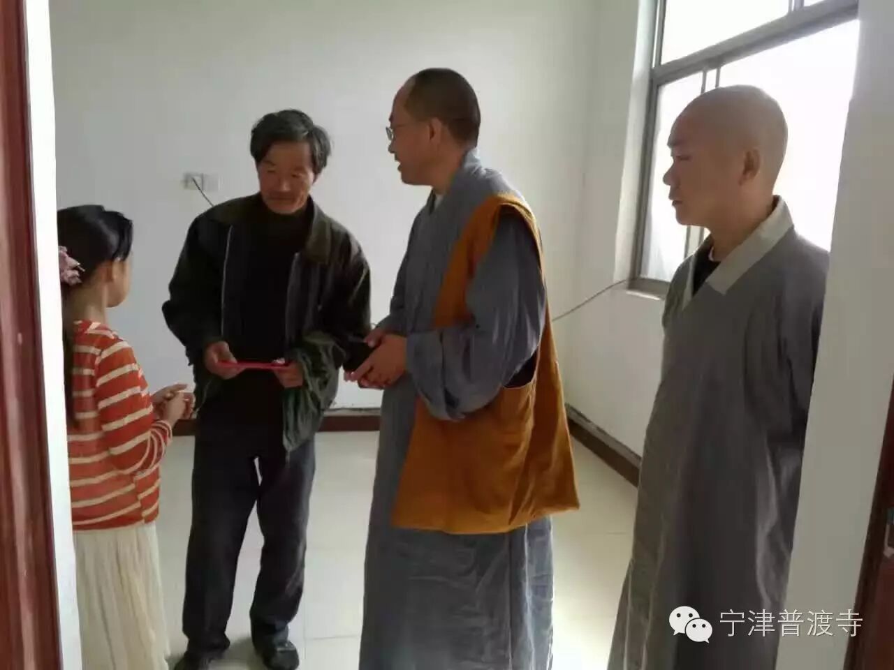 2016年国庆节期间,普渡寺耀宗法师走访慰问了宁津县相衙镇的两个特困家庭的学生。一个是门道口村的门丽慧,一个是大耿村的洪爱爱。两个孩子都经历着家庭的困苦,学习生活很困难。但据老师们反映孩子学习成绩都很好,在学校多次得到奖励。为更好的落实人间佛教慈悲济世的情怀,耀宗法师利用个人网络影响力积极募化善款,为长期改善这些就学困难的孩子的学习和生活做保障。